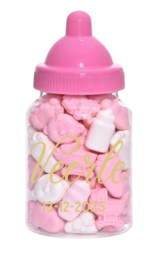 Het transparante flesje met gekleurde speentop geeft een speelse en luxe uitstraling en kan gepersonaliseerd worden met naam en geboortedatum. Ideaal om neer te zetten op de kraamtafel, uit te delen aan bezoek of te gebruiken als decoratief detail bij de babyshower of kraamfeest.